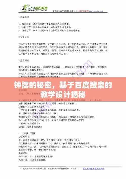 钟摆运动是物理学中一种典型的简单机械振动,对于帮助学生理解周期运动、速度、加速度等物理概念具有重要意义,随着科技的发展,钟摆运动在教学中的应用愈发广泛,本文将结合百度搜索资源,为大家提供一份关于运动的钟摆的教案。