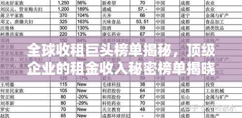 随着全球经济的发展,越来越多的公司凭借其卓越的经营策略、丰富的资产和强大的品牌影响力,在收租市场上占据领先地位,本文将为您揭示世界公司收租排名的相关情况,带您了解这些全球顶级收租企业的成功秘诀。