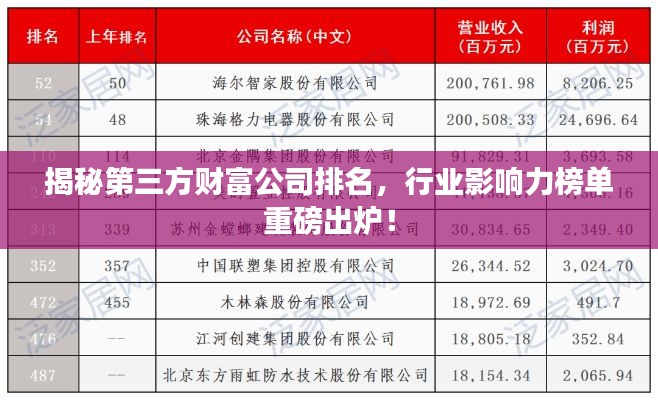 随着金融市场的不断发展和创新,第三方财富公司在中国金融市场中的地位日益凸显,这些公司在提供多元化财富管理服务方面表现出色,为投资者提供了更多选择,本文将探讨第三方财富公司的排名及其行业影响力。
