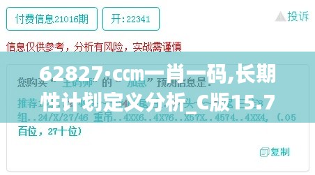 “62827·c㎝一肖一码”是指特定的代码或者象征,用于长期计划中标识项目或行动的关键步骤。在我们进一步探讨该术语如何植入长期性计划的各个部分时,有必要首先确立其基本含义。根据行业规则,“62827”是一个特定的数字标识,而“c㎝”则是衡量单位,“一肖”意味着单一的特征或属性,“一码”则暗示了这是一种编码方式。在长期性计划的定义分析中,“62827·c㎝一肖一码”是一种关键的资源标识码,它使得管理者、规划者以及执行人员能够快速、准确地识别项目的核心组成部分,并对其进行跟踪、调整和优化。